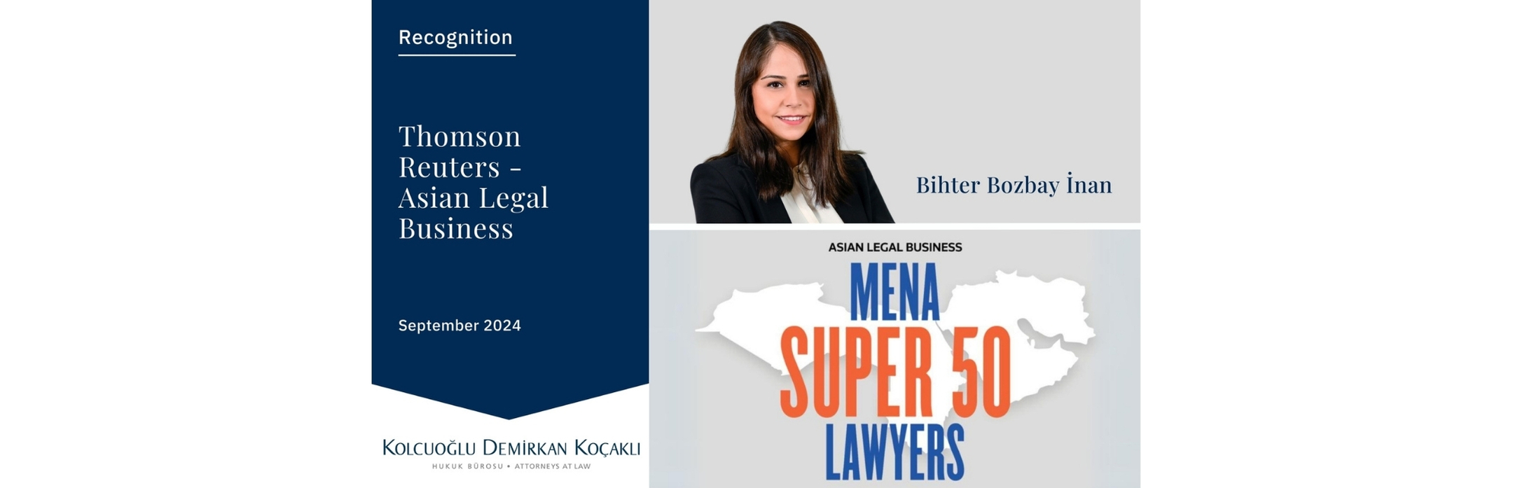 Av. Bihter Bozbay İnan’ın Thomson Reuters - Asian Legal Business tarafından MENA bölgesindeki “En Güçlü 50 Avukat” arasında gösterildiğini duyurmaktan mutluluk duyuyoruz.